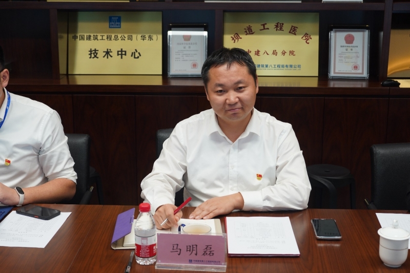 马明磊院长致辞,代表研究院对我校一行表示热烈欢迎,介绍了中建八局“军魂匠心、家国情怀、令行禁止、使命必达”的铁军文化,并表示要与我校双向赋能、党建共建,深化产教融合,打造“产学研用”闭环创新链。