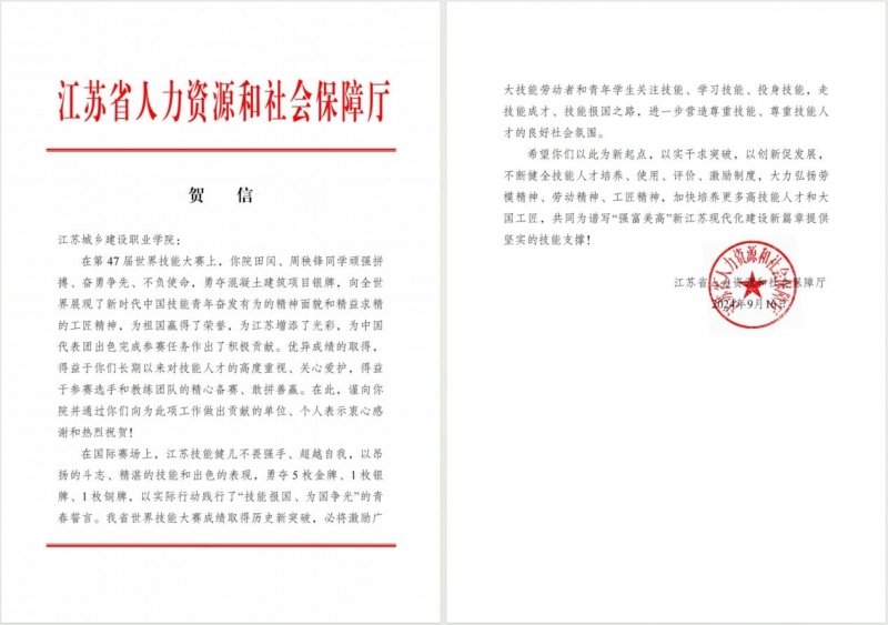 近日,我校收到了来自江苏省人力资源和社会保障厅发来的贺信,对我校获得第47届世界技能大赛混凝土建筑赛项银牌表示热烈祝贺。信中高度赞扬了我校在本次大赛中为国家展现出的新时代中国技能青年的精神面貌和工匠精神,为祖国和江苏省增光添彩,充分肯定了我校出色完成参赛任务作出的积极贡献,对我校在技能人才培养工作上的高度重视表示衷心感谢!