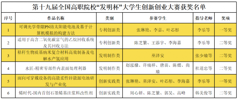 本届大赛由中国发明协会、山东省教育厅和山东省人力资源和社会保障厅共同主办,国家知识产权局专利局人事教育部指导,中国发明协会高等职业院校发明创新分会和山东理工职业学院承办。大赛以“知识产权推动创新,科学技术推进文明”为主题,吸引了来自全国153所高职院校的踊跃参与,共提交作品36165件,其中400件入围决赛。在本次大赛中,我校学子凭借扎实的专业功底和突出的创新能力,斩获佳绩。其中,公用事业学院张琳艳等同学完成的《可调光学带隙PN结太阳能电池及基于计算机模拟的构建方法》和《面向可穿戴设备的高能柔性锌能源电池研发与产业化》荣获一等奖,《适用于高含二氧化碳富气的乙烷回收系统及其回收方法》等4件作品荣获二等奖。