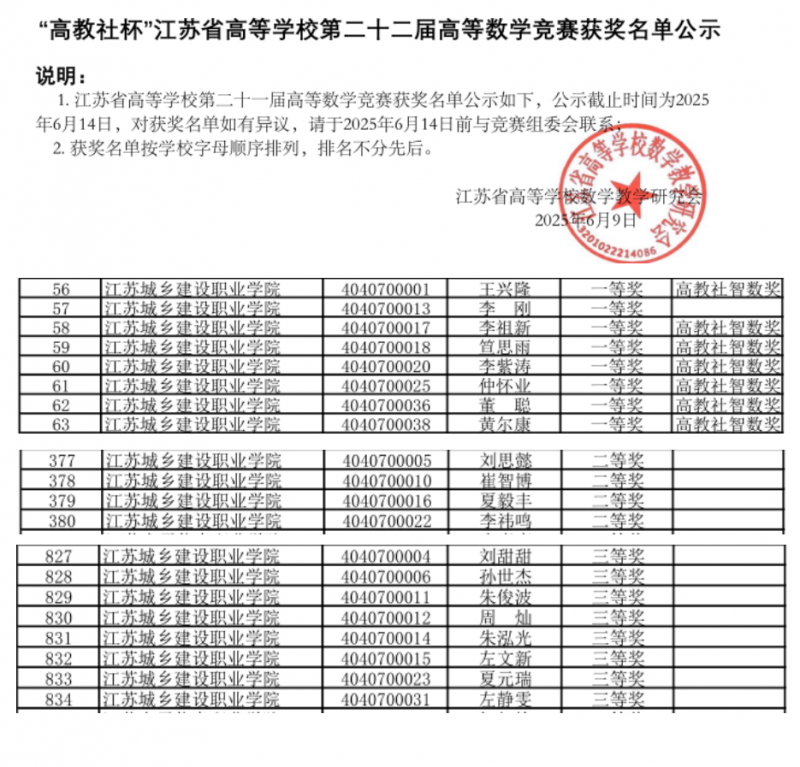 近日,由江苏省教育厅高等教育处指导,江苏省高等数学教学研究会主办的省高等学校第二十二届高等数学竞赛结果揭晓。我校学子获得优异的成绩,共20人获奖,其中一等奖8人(7人成绩进入省前100名,获得“高教社智数奖”),二等奖4人,三等奖8人,获奖人数创历史新高。