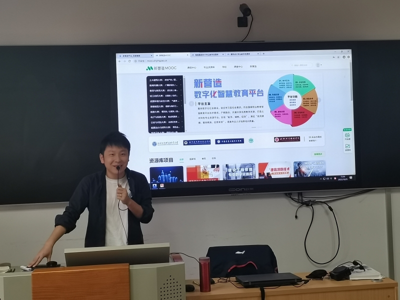 专业教学资源库辐射覆盖多专业,其建设推进离不开全体教师的共同努力。第二部分,邓磊老师对建筑设计专业教学资源库的课程建设逻辑进行了简单演示,旨在使全体教师都会建、会用,完成使用习惯的转变。邓磊老师从新营造在线平台的课程建设逻辑、建设步骤、题库管理和教学互动等方面进行了说明。
