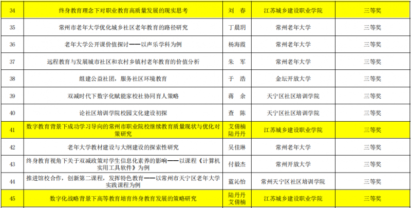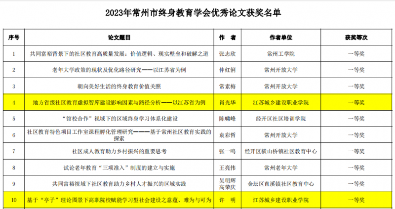 近日,由常州市终身教育学会、常州市社会教育指导中心组织的2023年常州市终身教育学会优秀论文评选结果出炉。我校送评的论文共计获奖7篇,其中一等奖2篇,分别是《地方省级社区教育虚拟智库建设影响因素与路径分析——以江苏省为例》(设备工程学院肖光华)、《基于“亭子”理论图景下高职院校赋能学习型社会建设之意蕴、难为与可为》(继续教育学院许明);二等奖2篇,分别是《近十年国内终身教育研究热点与前沿——基于Cite space的可视化分析》(管理工程学院周九一)、《校社协同视域下乡村长者跨越数字鸿沟的教育路径研究》(设备工程学院孟亚俐、许明);三等奖3篇,分别是《终身教育理念下对职业教育高质量发展的现实思考》(教务处刘春)、《数字教育背景下成功学习导向的常州市职业院校继续教育质量现状与优化对策研究》(公用事业学院艾倩楠、陆丹丹)、《数字化战略背景下高等教育培育终身教育发展的策略研究》(公用事业学院陆丹丹、艾倩楠)。