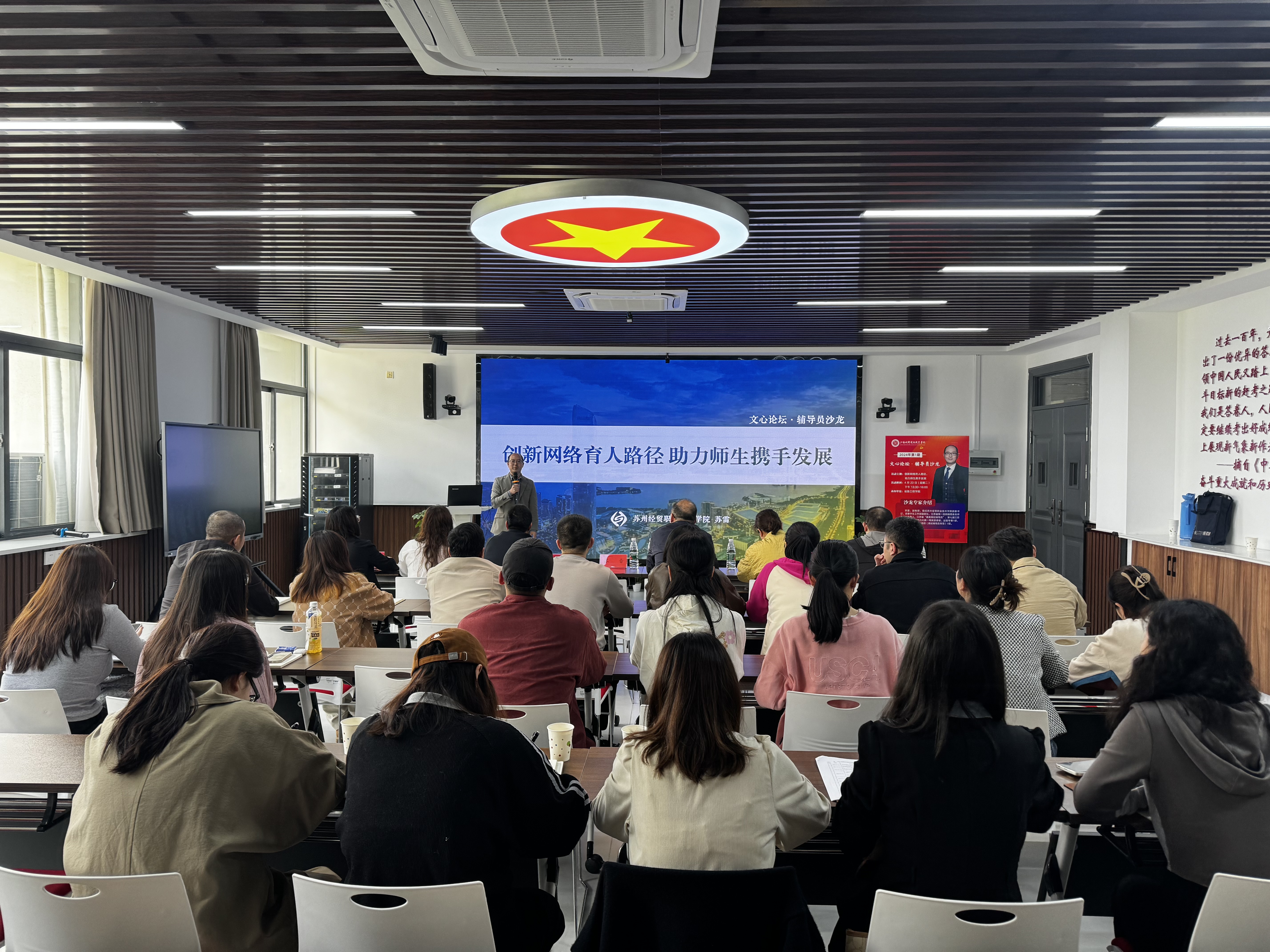 为进一步提升辅导员专业能力素养,强化辅导员队伍专业化职业化建设,4月23日,由设备工程学院承办的2024年“文心论坛·辅导员沙龙”(第1期)在6307举行。活动围绕“创新网络育人路径,助力师生携手发展”主题,邀请了苏州经贸职业技术学院团委书记苏雷作专题培训,校党委委员、副校长周炜炜,学生工作处处长、校团委书记刘波,校团委副书记周文斌,学生工作处副处长祝琳,各二级学院党总支副书记,全体辅导员及相关工作人员参加此次活动。活动由设备工程学院党总支副书记缪小燕主持。