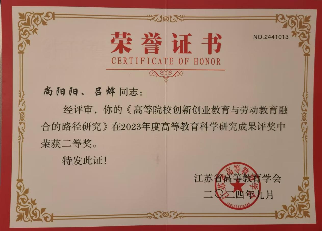 江苏省高等教育学会发布了《关于公布2023年度高等教育科学研究优秀成果奖的通知》(苏高教会〔2024〕41号),我校尚阳阳老师的研究成果《高等院校创新创业教育与劳动教育融合的路径研究》荣获二等奖。