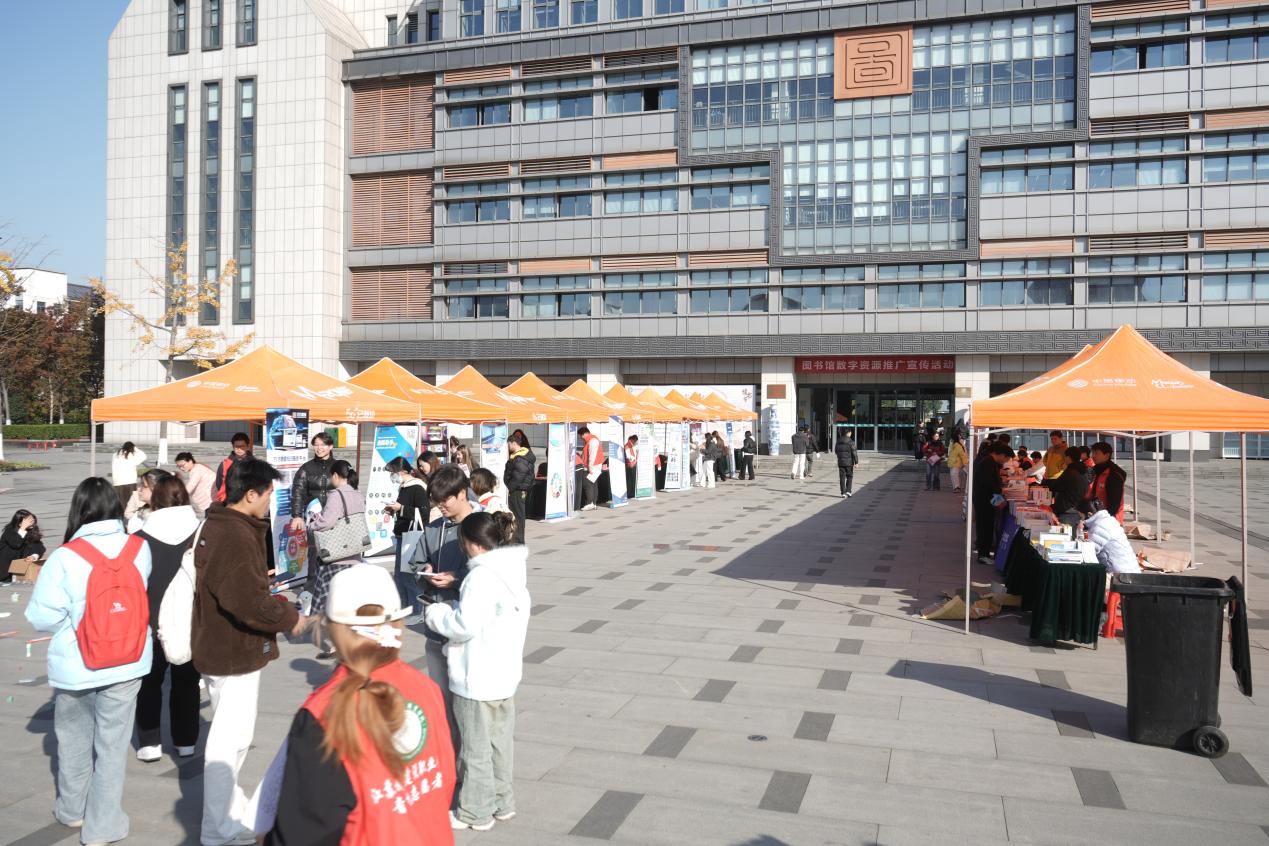 为进一步丰富校园文化生活,提升师生对数字资源的利用效率,加强教材建设与交流,11月26日,我校图书馆在思成广场举办了2025年秋学期数字资源推广暨教材巡展活动。作为第十一届“思成”读书节主题系列活动之一,此次活动汇集了25家数字资源服务平台、7家出版社,晨曦读书社社员担任志愿者组织现场活动,吸引了全校2000余名师生读者到场参与。